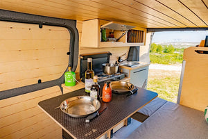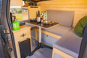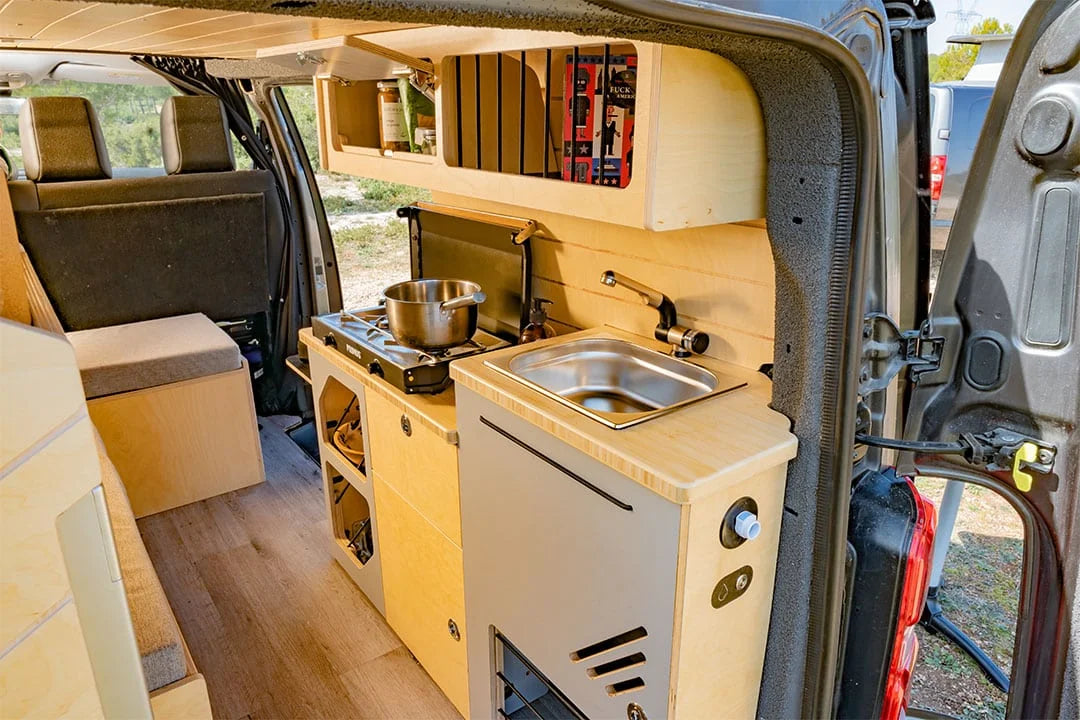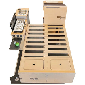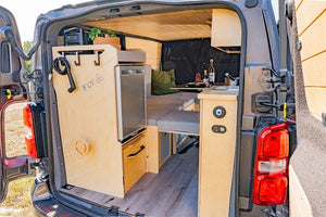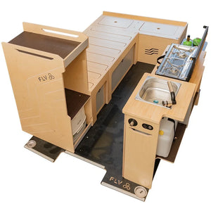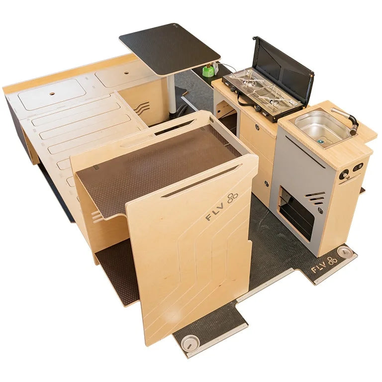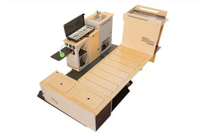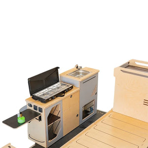 Combinaison de nos modules les plus populaires, le kit Honey est conçu pour ceux qui recherchent l'autonomie et le confort sans compromis. L'agencement cosy maximise l'espace de vie et de rangement, transformant votre utilitaire en un véritable camping-car élégant.