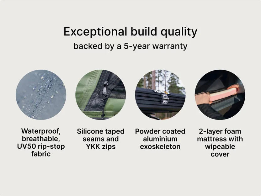 TentBox propose une garantie constructeur de 5 ans couvrant la structure, la coque et les matériaux textiles. Les pièces détachées et accessoires sont disponibles sur demande. Une assistance technique complète est assurée pour prolonger la durée de vie du produit.