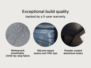 Conçue pour être utilisée toute l’année, la TentBox GO résiste à la pluie, au vent et aux variations de température rencontrées dans des conditions normales. Sa housse externe en polyester 210D (étanchéité 5000 mm) bénéficie d’un traitement déperlant (DWR C6) et d’une protection UV 50+, garantissant durabilité et résistance face aux éléments.