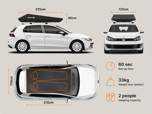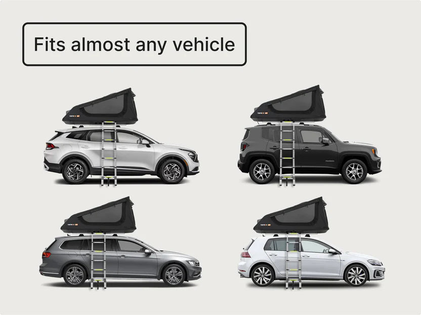 La TentBox GO est compatible avec la majorité des voitures, breaks, SUV et fourgons légers. Elle nécessite des barres de toit capables de supporter au minimum 50 kg de charge dynamique. Aucune modification du véhicule n’est nécessaire.